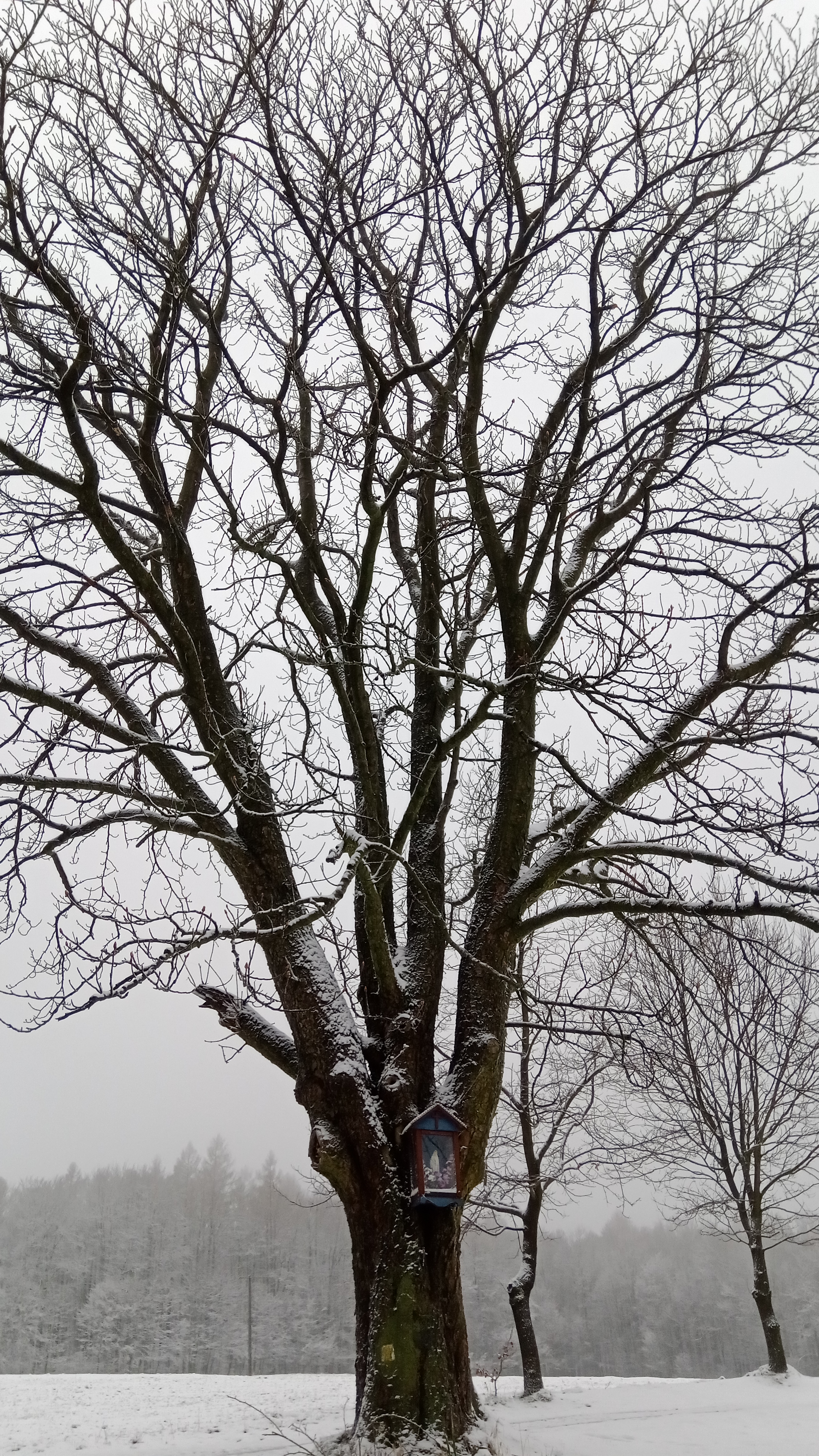 Świt to już okolice Dębicy. Pola ukryte w kępkach samosiejek kapliczki. Kałuże zamarznięte, jedne pozwalają przejść inne pękają z trzaskiem, buty przemokły mi już dawno, więc i tak nie robi to na mnie większego wrażenia, mam dwie pary skarpet, w tym rewelacyjne od Aneczki, trekkingowe, nawet totalnie mokre trzymają ciepło i nie robią pęcherzy na stopach!